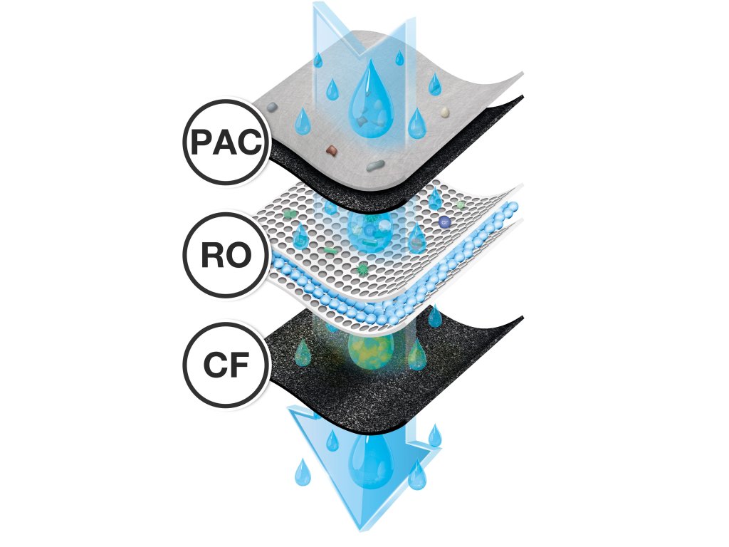 - RO membrána (0,0001 µm) – jádro systému; odstraňuje bakterie, těžké kovy a další rozpuštěné látky.