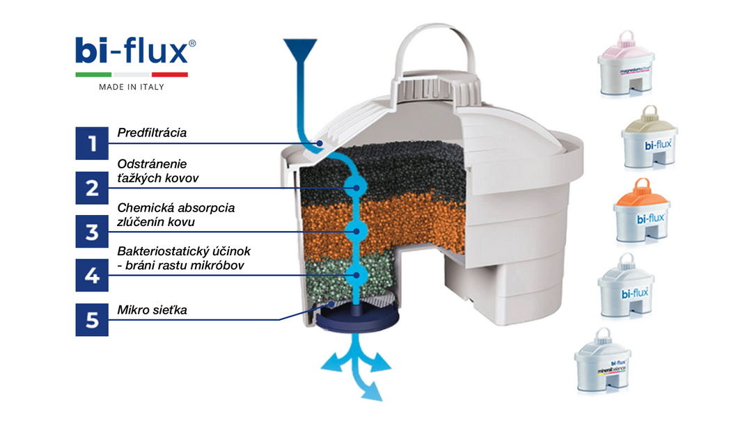 2,3 l • 1,2 l filtrované vody • 12× bi-flux® • indikátor výměny • BPA-free • do dveří lednice • Made in Italy (dle výrobce)