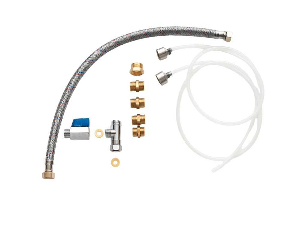 Souprava jednotlivých instalatérských dílů pro propojení rohového ventilu (studená voda) s regulátorem tlaku (není součástí), filtrem Dionela a trojcestnou směšovací baterií. Vše potřebné pohodlně v jednom balení.